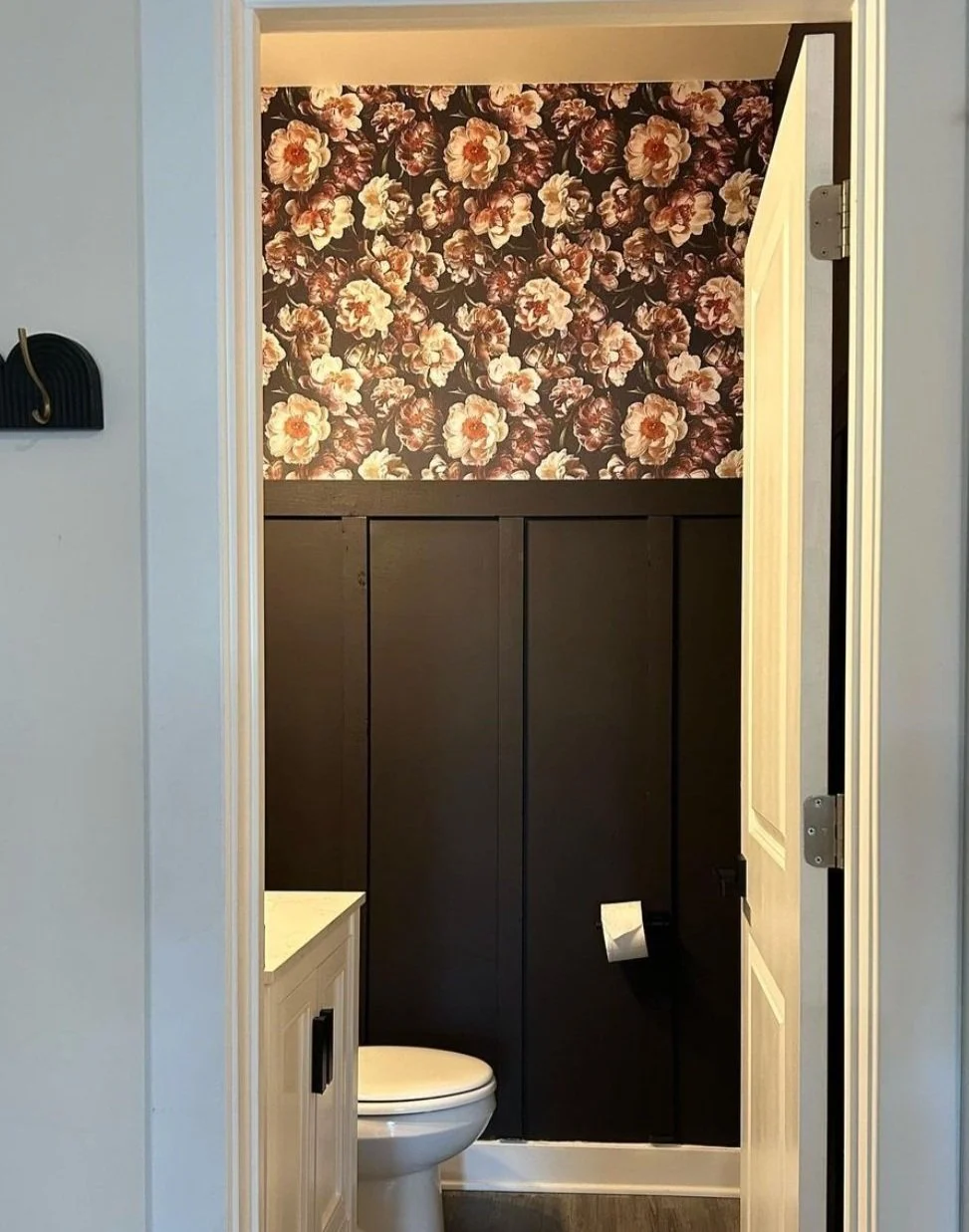 Added wallpaper, board + battern + paint to middle floor half bath, also a guest bathroom.